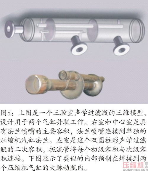 通常认为采用声学滤波技术设计高速压缩机组的脉动瓶是最佳做法。声学滤波器是一种体积-扼流圈-体积组件,对于简单的单缸系统,它可以由两个独立的瓶子组成,两个瓶子具有一个互连的管道(扼流圈),如图4中的下图所示。或者,它可以是单个的瓶子,带有一个内部挡板,将主缸腔室与次级管腔室分开,并且在两个腔室之间有一个扼流管,如图4中的上图所示。图5显示了一个三腔室声学过滤瓶的三维模型,该过滤瓶设计用于并行操作的两个汽缸。右室和中心室是具有法兰喷嘴的主要容积,法兰喷嘴连接到单独的压缩机汽缸法兰。左室是这个双圆柱形声学过滤瓶的二次容积。扼流管将每个初级容积与次级容积连接。图5中的下图显示了在焊接到两个压缩机气缸的大脉动瓶内之前预制的类似内部构件。图6显示了安装在大型高速压缩机上的这种类型的瓶子。入口洗涤器是图6右边缘的垂直容器,通常用作压缩机吸入侧声学滤波器设计的次级容积。吸气瓶和进气洗涤器之间的短管尺寸是这种情况下声学过滤器的扼流圈。