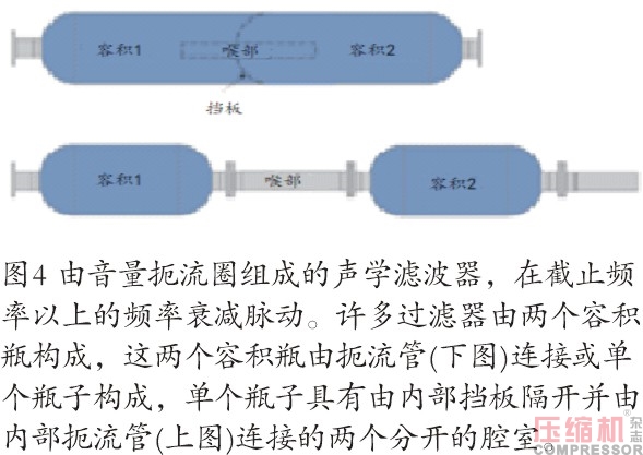 压缩机管道系统中的脉动控制可以通过适当应用柔顺性(容积瓶或喘振鼓)、电感(扼流圈)和电阻(压降)的基本声学元件来实现。这些元件可以组合成从脉动的衰减到真正的声学滤波在内的各种组合来实现脉动控制。常见的脉动衰减元件包括膨胀容积(通常称为脉动瓶)、扼流管、孔板以及这些元件的组合。独立的脉动控制系统被设计并制造出来,用于各个阶段的吸入和排出。